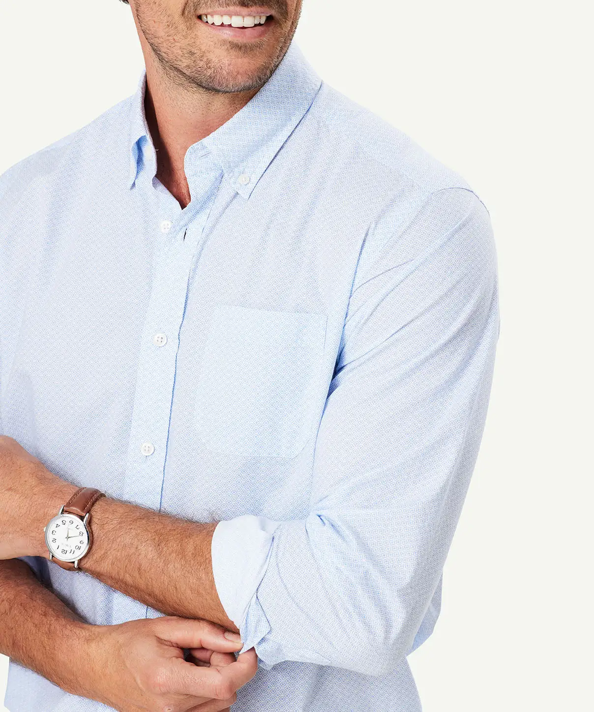Designed with a subtle geo print pattern, this casual men’s long sleeve shirt is a staple for adding a bit more fun to your shirt rotation. Constructed from a soft to touch cotton, this shirt is ideal for smart casual looks. A regular cut shirt that hangs off the body but isn’t too baggy, complete with a button down collar and chest pocket feature. Pair this shirt with neutral chinos to really make this a statement shirt.