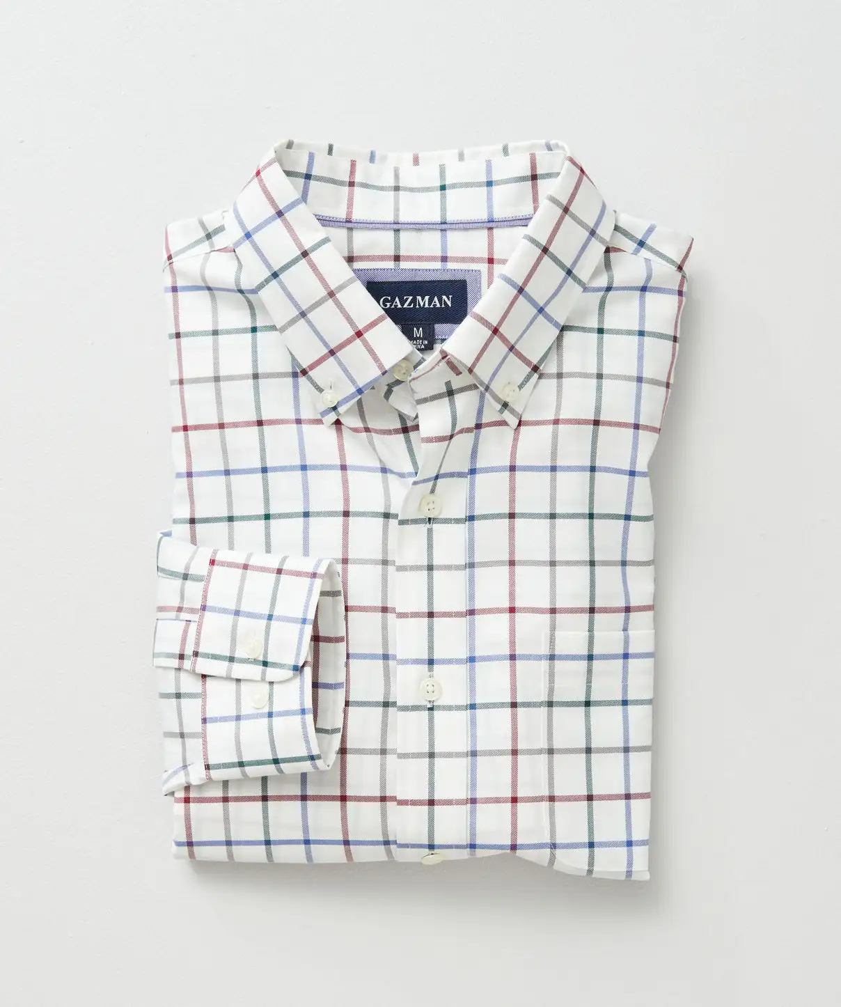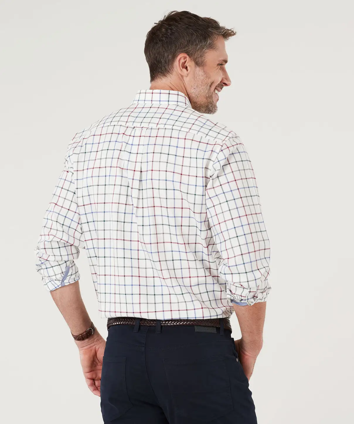 A white base brings out the fresh maroon and blue checks of this cotton shirt. Finished with easy care technology, this shirt is comfortable and stays looking crease free for longer.