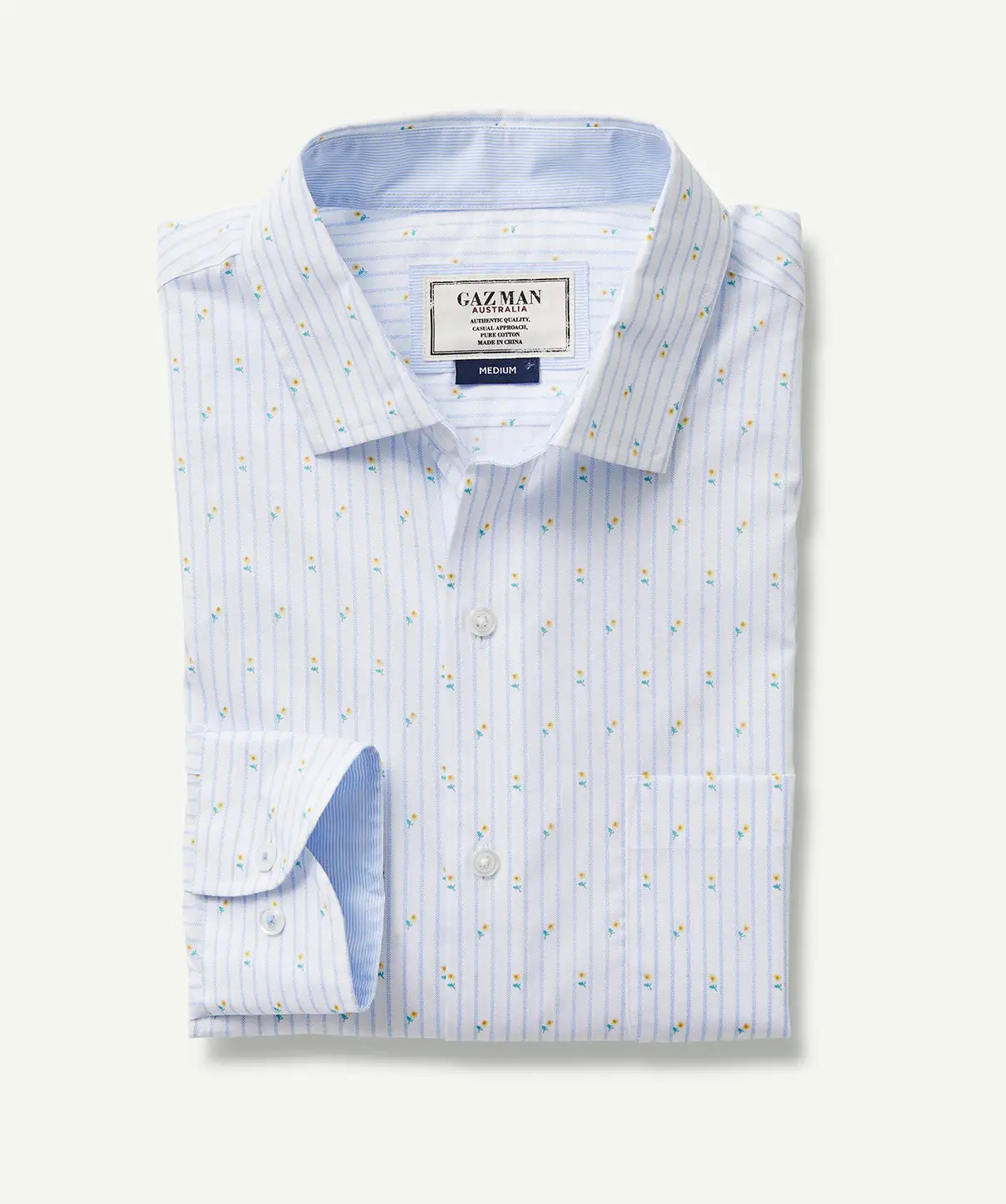 A subtle nod to spring florals, this white and blue stripe shirt adds a fun element to your wardrobe. Wear it together with blue chinos or shorts to embrace colour this season.