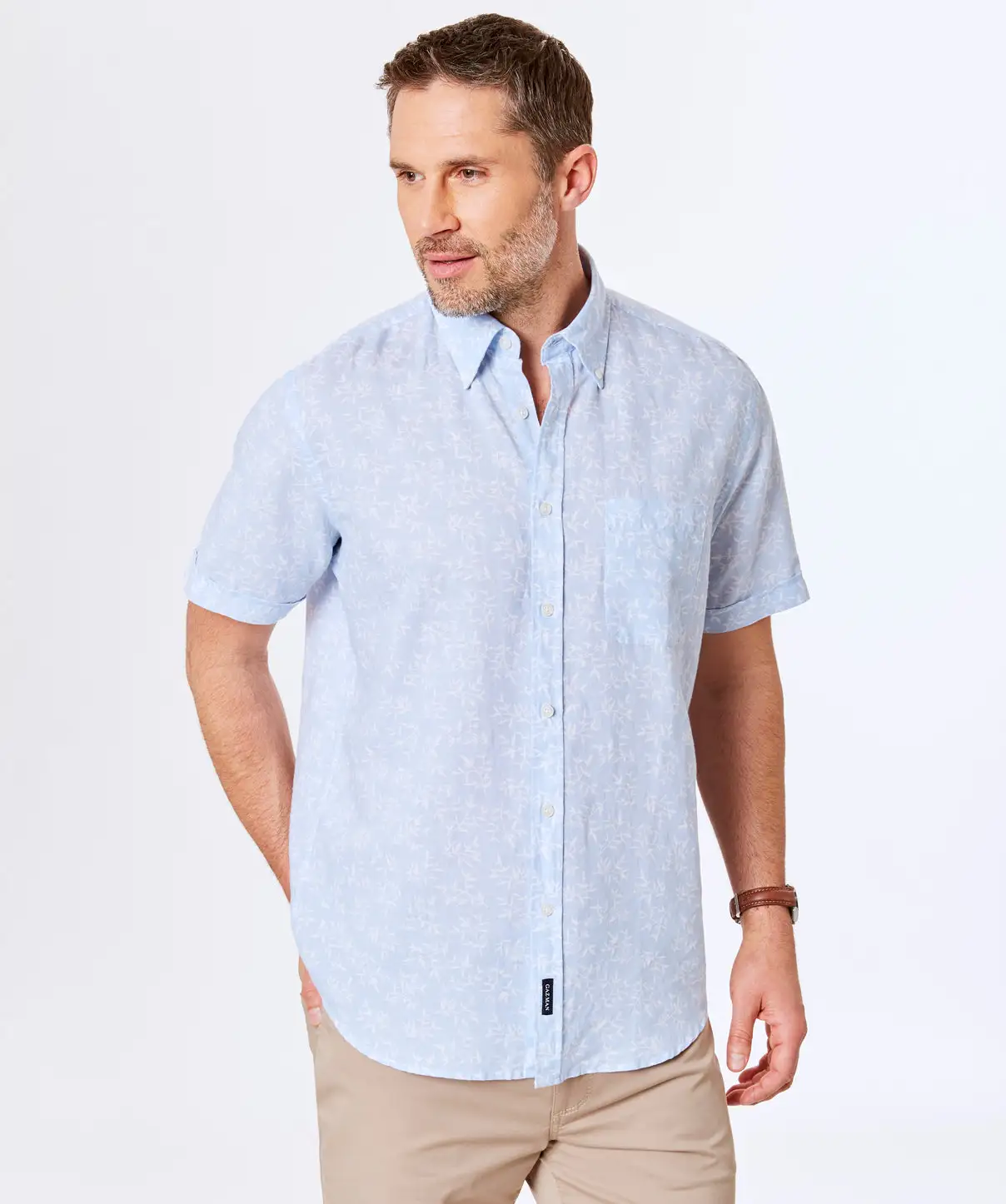 A subtle take on a Hawaiian shirt, this linen blend short sleeve shirt is perfect for summer. Featuring a white print on a sky blue base, this regular fit shirt is made from a cool and comfortable blend of linen and cotton.
