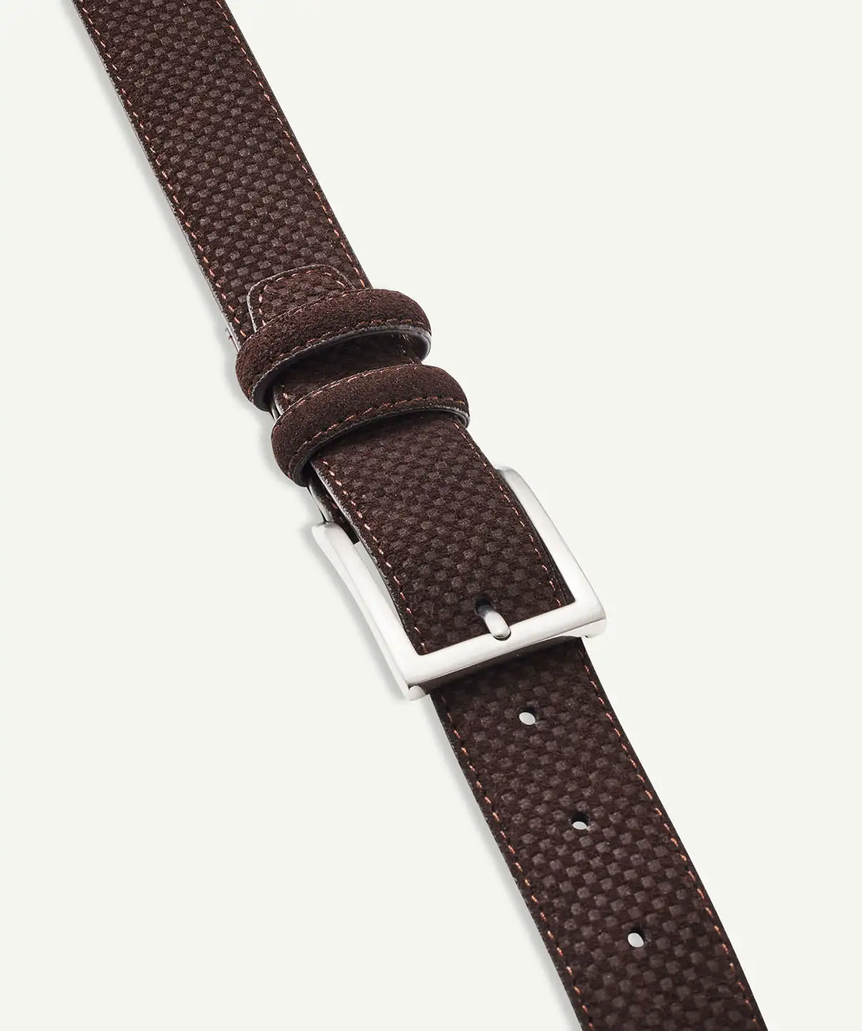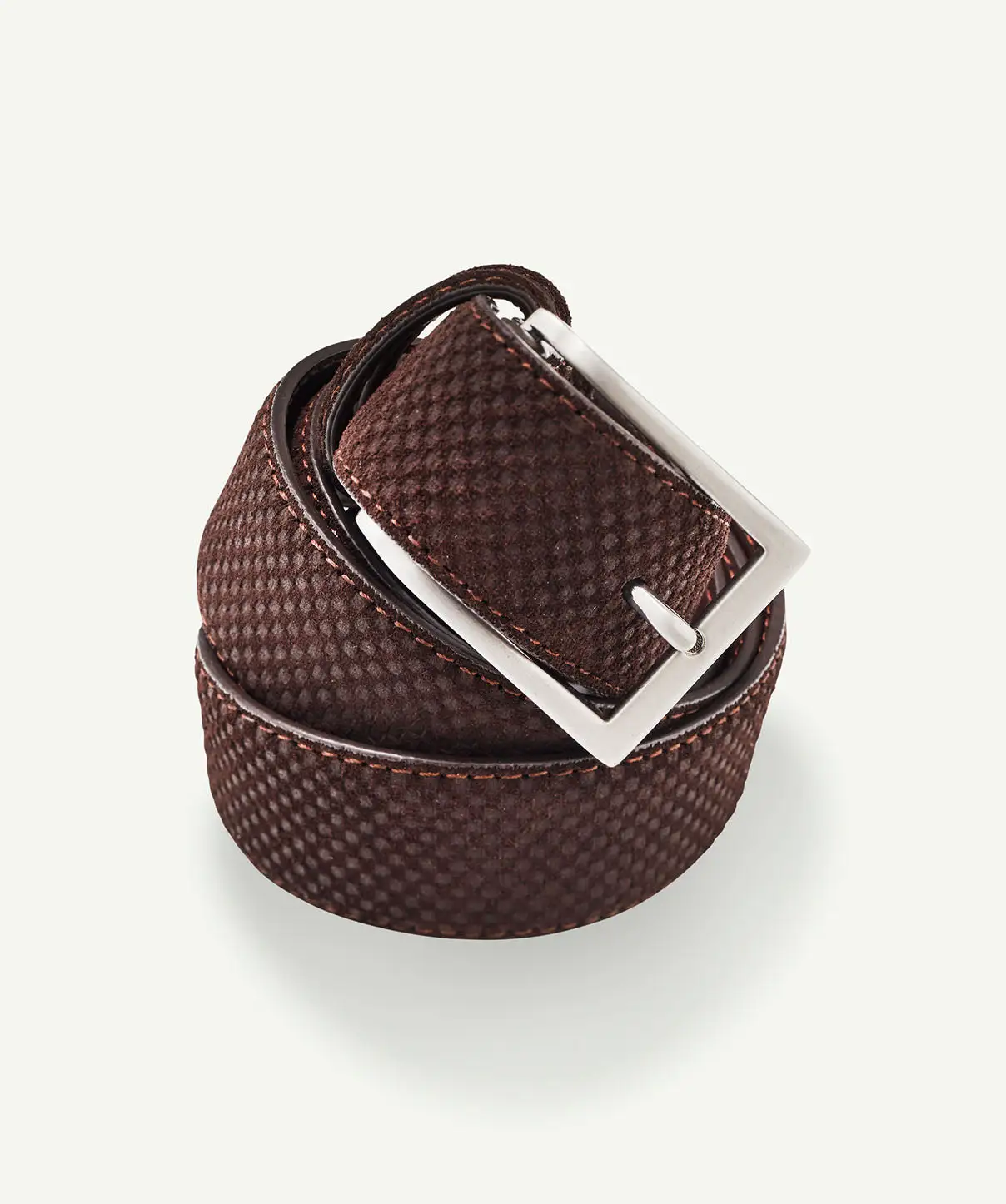 This suede belt makes for a classic accessory. Crafted from a suede leather and featuring a checked pattern, this belt is subtle enough for work as well as a dress event.