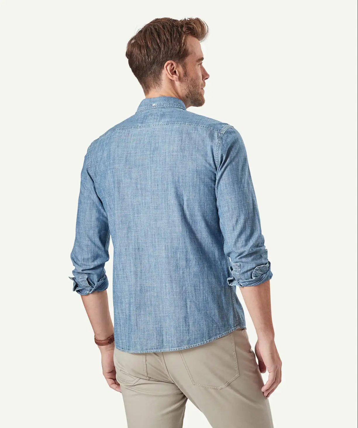 An easy and comfortable tailored shirt that will take you from the office to Friday night drinks with ease. The chambray gives the shirt a nice colour and texture that elevates a smart casual outfit. The soft touch cotton shirt pairs well with navy or tan chinos.